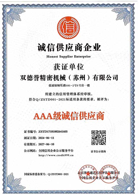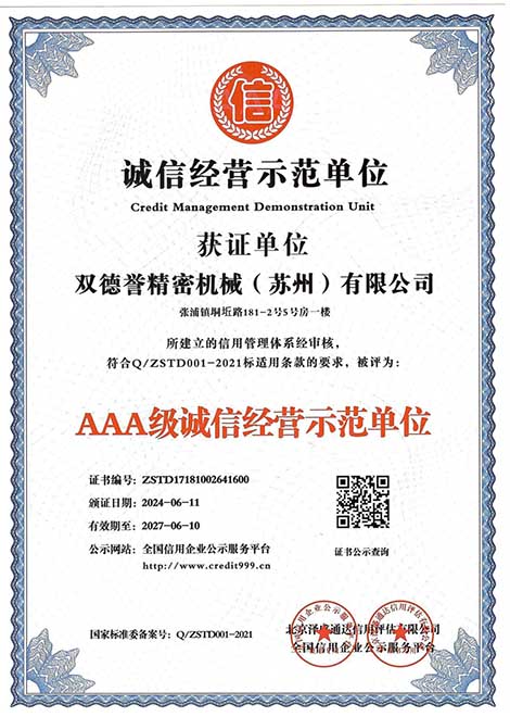 誠信經(jīng)營示范單位-雙德譽精密機械(蘇州)有限公司