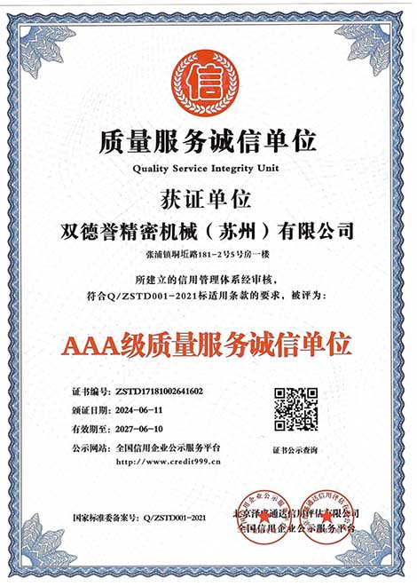 質(zhì)量服務(wù)誠信單位-雙德譽精密機械(蘇州)有限公司